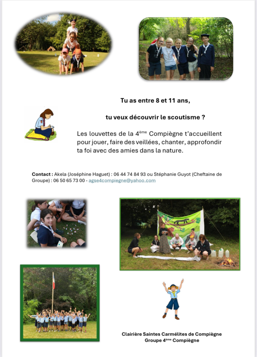 Les louvettes de la 4ᵉ Compiègne t’accueillent dans une ambiance joyeuse et fraternelle pour grandir dans la foi, apprendre l’entraide et découvrir les merveilles du scoutisme !