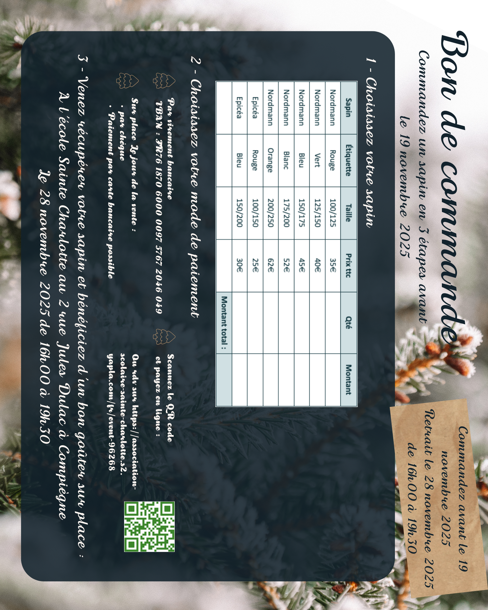 Vous pouvez commander jusqu’au 19 novembre à l’aide de ce lien Opération sapins de Noël 2025 ou du QR code (paiement en ligne), ou en déposant le bon de commande accompagné du paiement dans la boîte aux lettres de l’école.