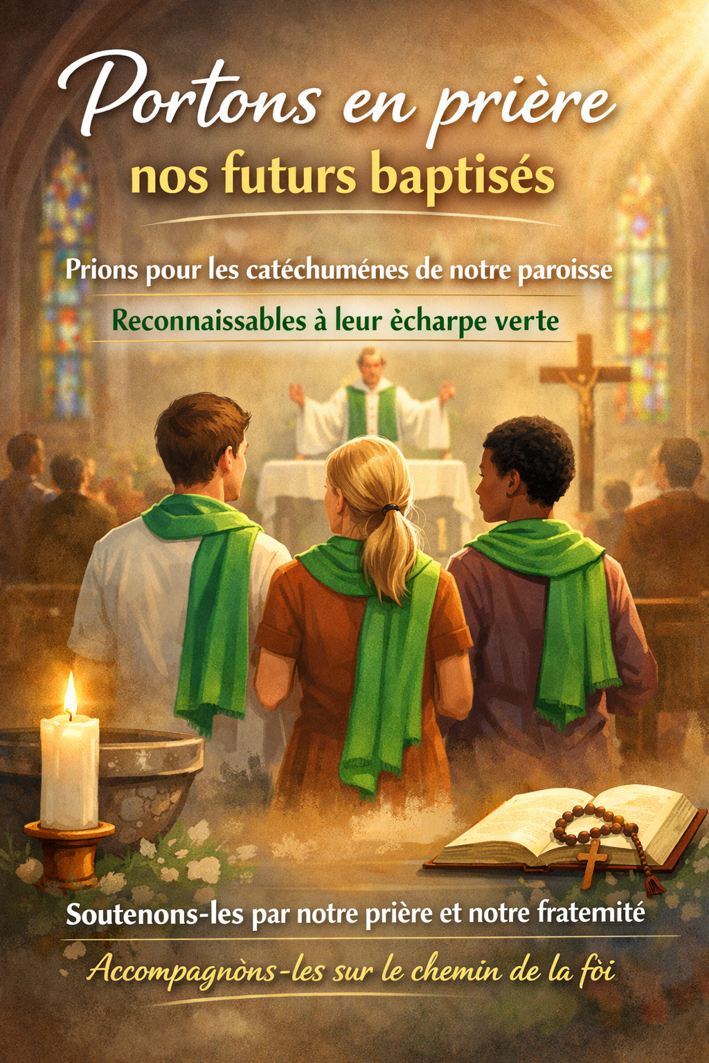 Dans nos assemblées dominicales, elles seront reconnues par l’écharpe verte qu’elles porteront, signe de leur cheminement vers le baptême. Nous sommes tous appelés à entourer ces frères et sœurs d’écoute, de bienveillance active et de prière, non seulement tout au long de leur parcours, mais aussi après leur initiation chrétienne.