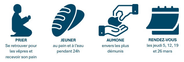 En pratique, nous nous retrouvons les jeudi 5, 12, 19 et 26 mars à 19h à l’église sainte Jeanne d’Arc de Margny. Un temps d’adoration et de confession sera proposé, puis un pain complet de 500g sera remis à chaque participant à 19h45 pour une fin à 20h. Le pain sera la nourriture pour les 24h suivantes. A l’issue de la distribution sera proposée une tisane, à volonté !